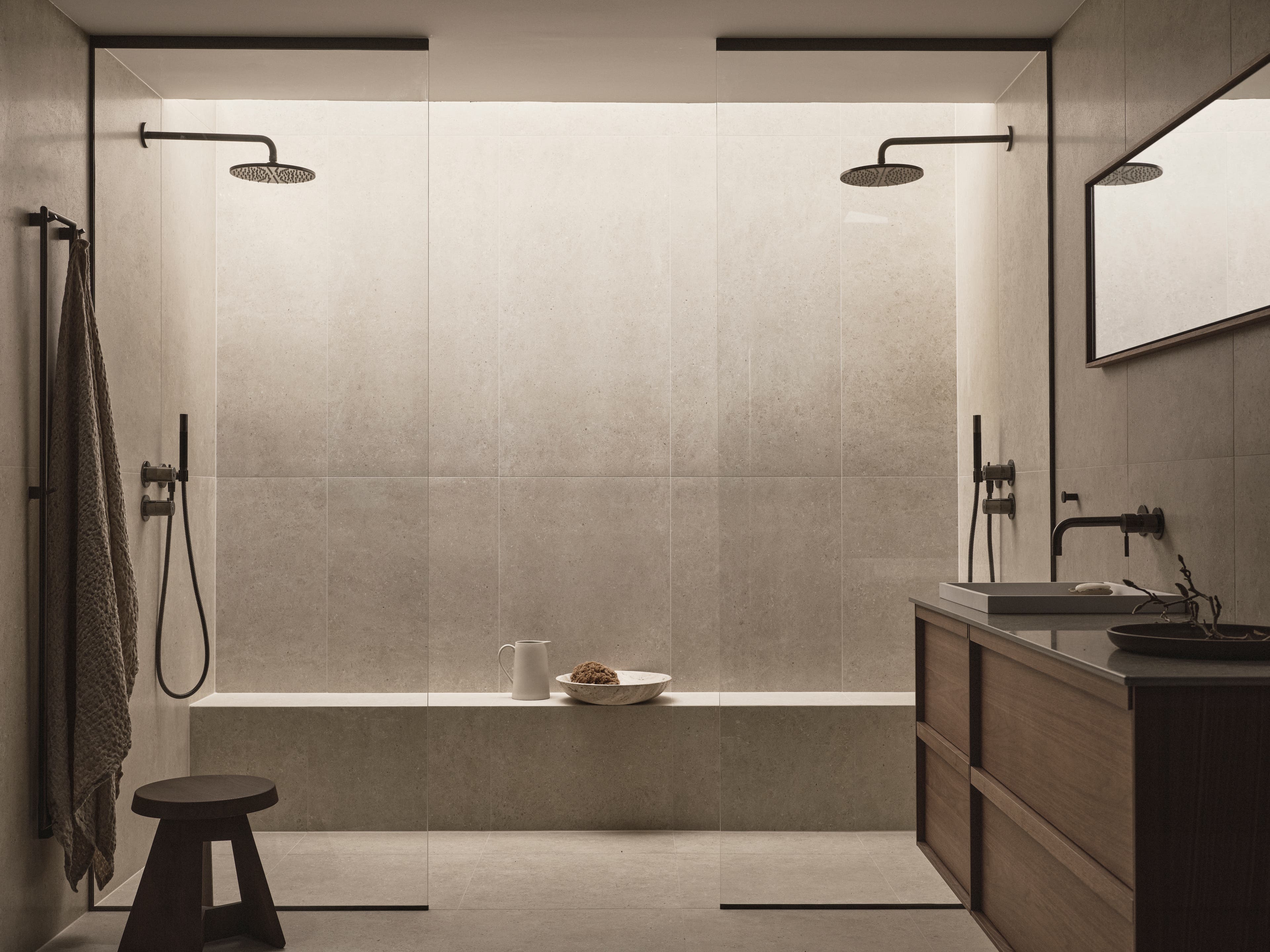 En duschvägg i 8 mm glas med diskret 10 mm väggprofil, placerad ovanpå en uppbyggd halvnisch klädd i Bricmates granitkeramik. Den fasta nischen skapar en naturlig avskärmning medan glaset behåller ett ljust och luftigt intryck.